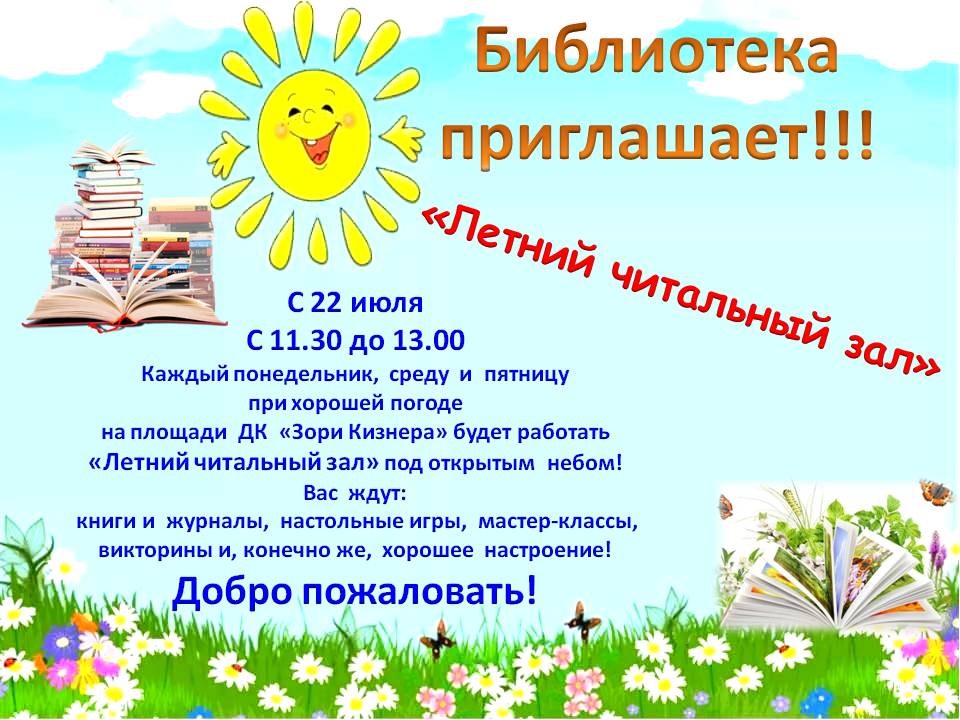 С 22 июля с 11.30 до 13.00  мы вас ждём на площади  ДК «Зори Кизнера» каждый понедельник, среду и пятницу. В «Летнем читальном зале»  для вас: книги и журналы, настольные игры, мастер-классы, викторины. Добро пожаловать!
