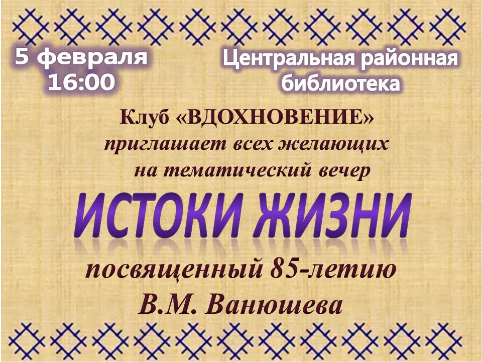 В рамках клуба состоится тематический вечер «Истоки жизни» посвящённый 85-летию В. М. Ванюшеву — удмуртскому поэту, писателю, публицисту, уроженцу и Почётному гражданину Кизнерского района.
