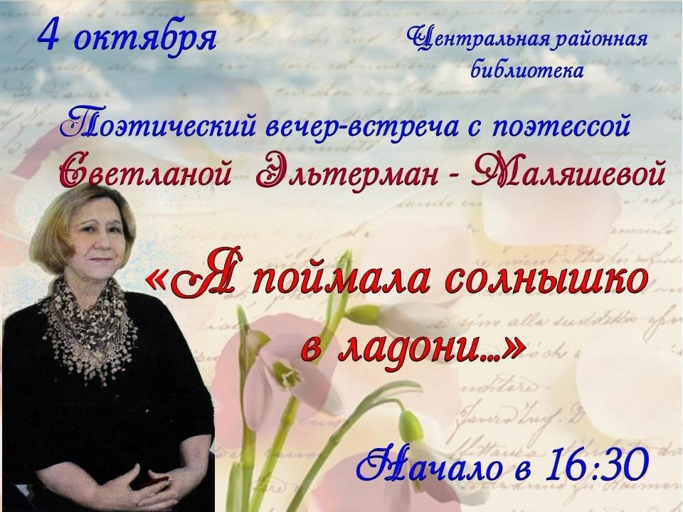 4 октября в 16.30 в читальном зале центральной районной библиотеки состоится поэтический вечер-встреча с поэтессой С. Эльтерман-Маляшевой «Я поймала солнышко в ладони…».
