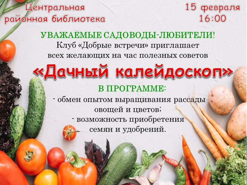 15 февраля в 16.00 Центральная районная библиотека приглашает всех желающих на час полезных советов «Дачный калейдоскоп»!