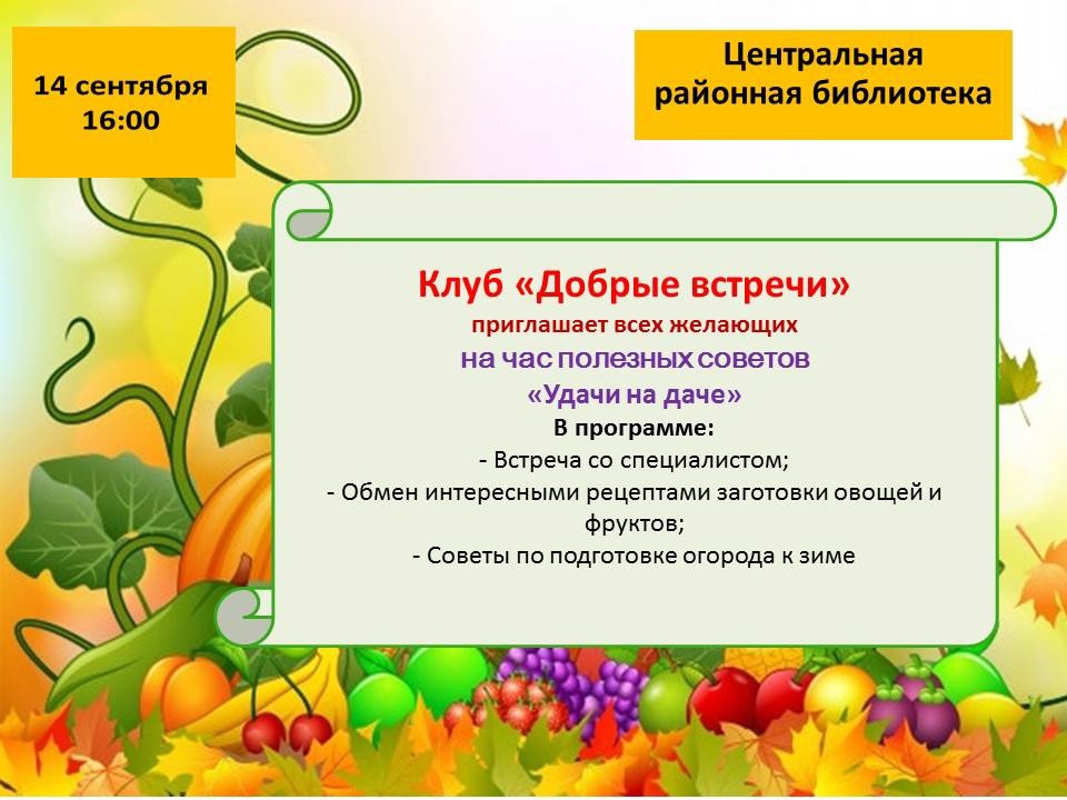 14 cентября в 16.00 Центральная районная библиотека приглашает всех желающих на час полезных советов «Удачи на даче».