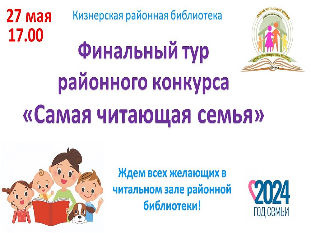 27 мая в 17.00 в Кизнерской центральной районной библиотеке состоится финальный тур конкурса «Самая читающая семья».