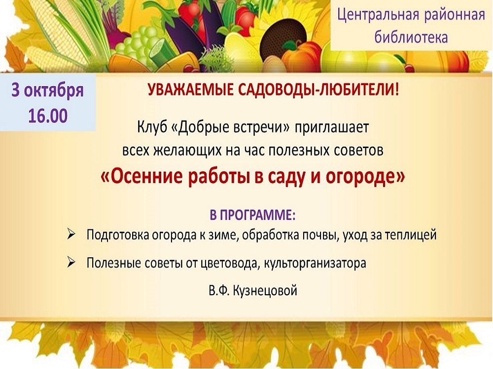 Уважаемые читатели! 3 октября в читальном зале Кизнерской центральной районной библиотеки состоится час полезных советов «Осенние работы в саду и огороде».