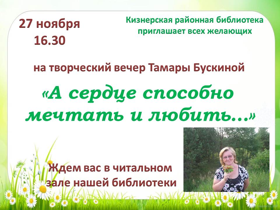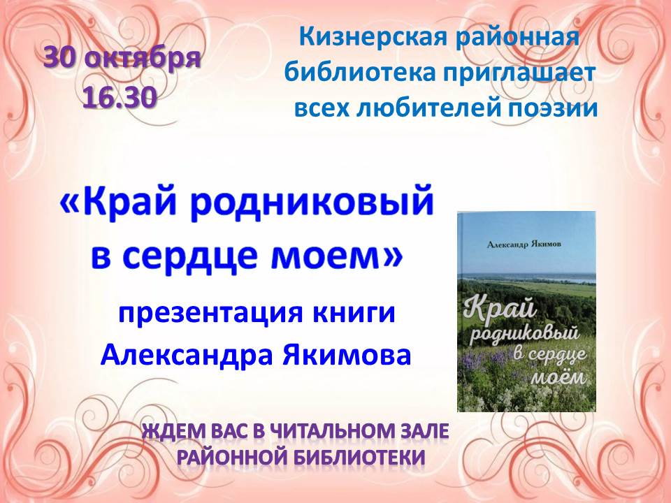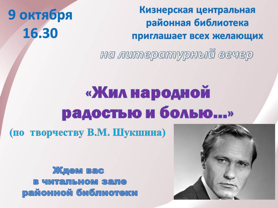 Уважаемые читатели! 9 октября в читальном зале Кизнерской центральной районной библиотеки состоится литературный вечер «Жил народной радостью и болью» .