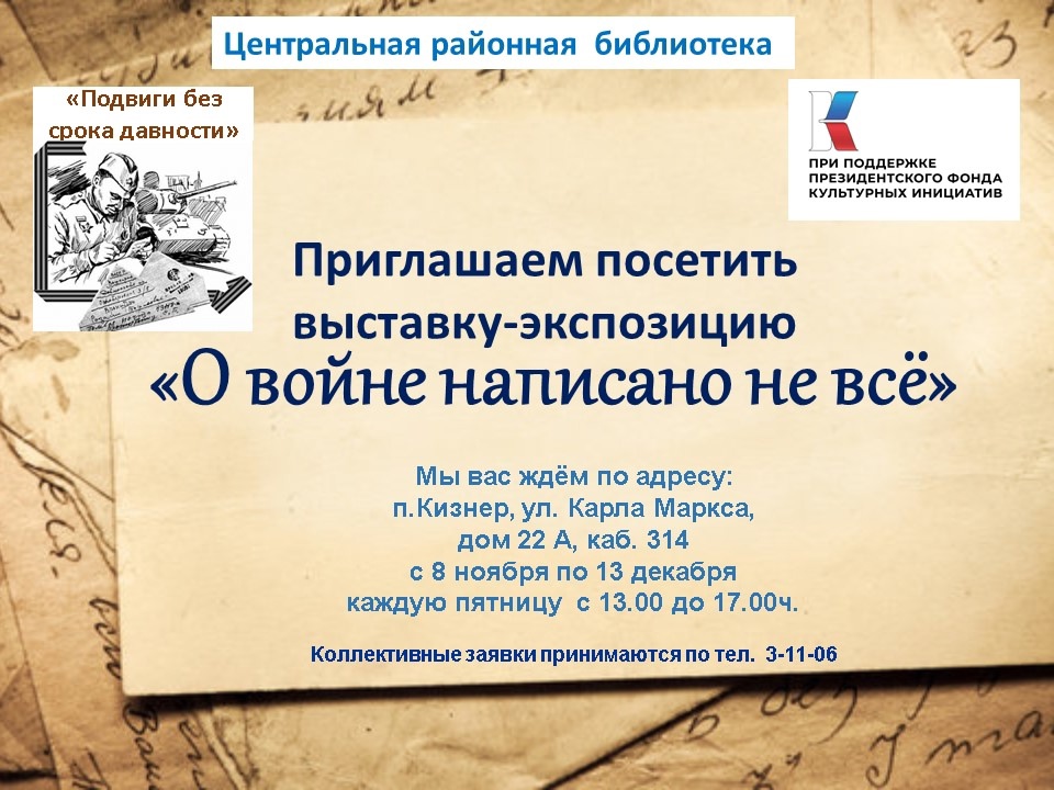 • Для своей безопасности вы можете воспользоваться услугой онлайн-продление книги в группе ВКонтакте «Кизнерская районная библиотека» или продлить книги по телефону – 3-11-06.