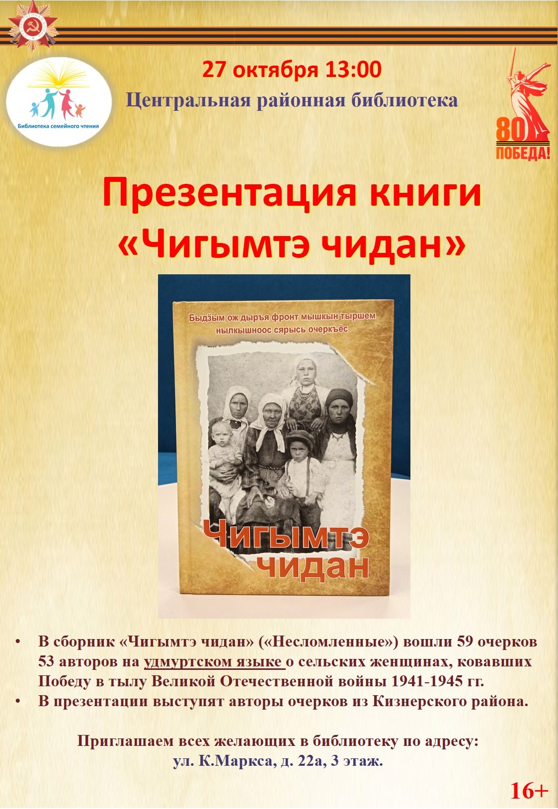 27 октября в 13:00 в Центральной районной библиотеке состоится презентация книги «Чигымтэ чидан» («Несломленные») на удмуртском языке о сельских женщинах, матерях и дочерях, которые ковали победу в тылу.