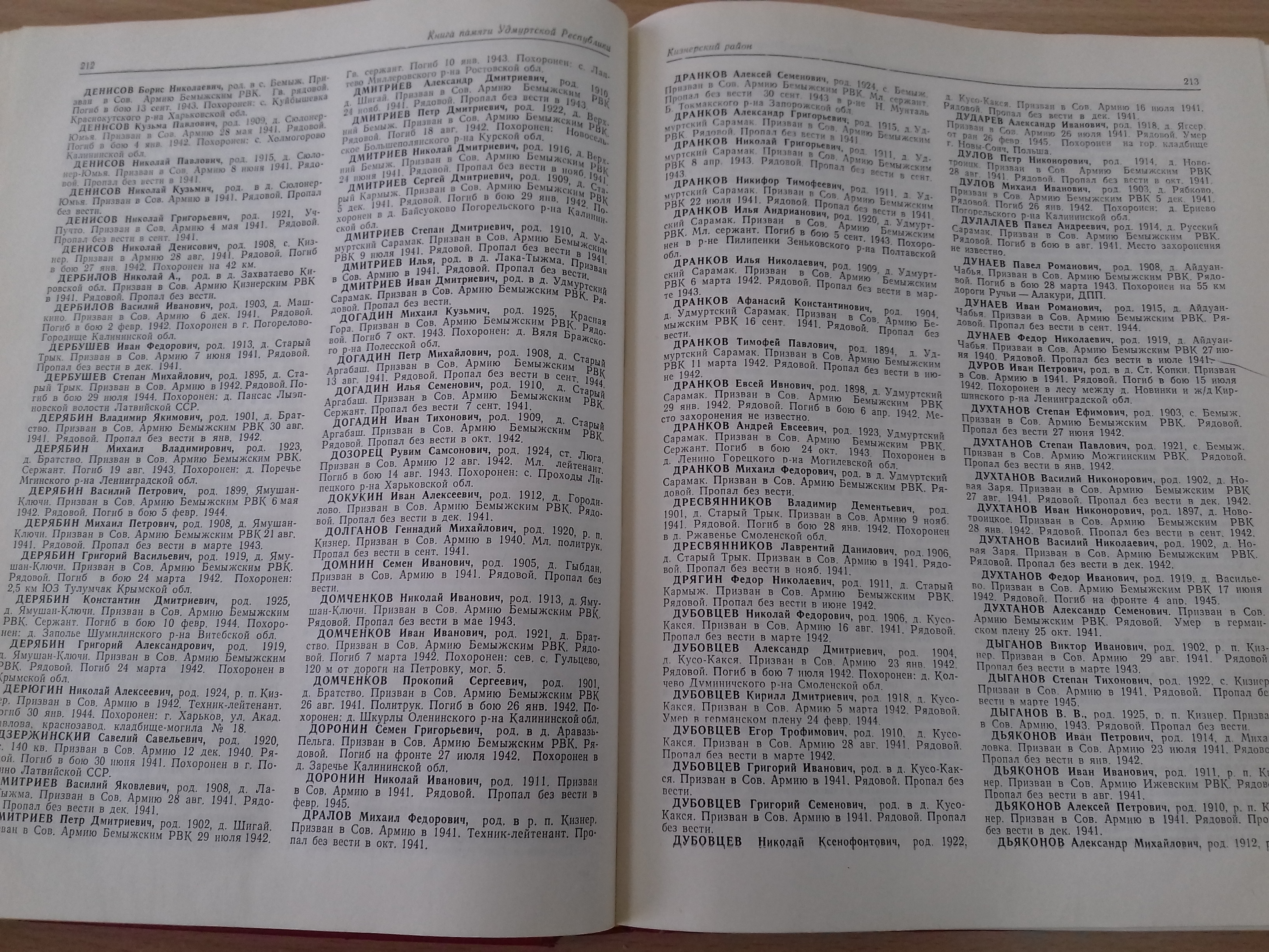 войны из Удмуртии в ряды Советской армии; о дивизиях, сформированных на территории Удмуртской Республики; в каких сражениях принимали участие наши воины; количество земляков, получивших звание Героя Советского Союза; количество погибших и вернувшихся с войны и многое другое. В разделе «Кизнерский район» опубликована статья о погибших солдатах и пропавших без вести на фронтах Великой Отечественной войны из нашего района, автором которой является А.В. Загумённов, ветеран, Почётный гражданин Кизнерского района. Сведения, представленные в «Книге памяти» очень нужны и ценны для всех поколений нашего района. Издание можно взять на абонементе Центральной районной библиотеки и позаниматься в читальном зале. Также, сотрудники библиотеки проконсультируют, как работать с книгой, помогут в поиске необходимой информации.
